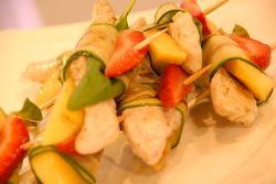 Obsmażamy je na mocno rozgrzanej patelni lekko natarte olejem bez przypraw z obu stron przez kilkanaście sekund z każdej strony. Odstawiamy rozłożone osobno plastry do wystudzenia. Kurczaka lub indyka kroimy w kawałki wielkości małego palca, marynujemy w mieszance grillowej z lejem i lekko obsmażamy żeby nie były surowe. Mango obrane ze skórki kroimy w cząstki. Na plastrach cukinii układamy po kawałku kurczaka, mozarelli i mango. Rolujemy ścisło i spinamy wykałaczką lub szpadką. Tak przygotowana roladka może być jeszcze raz podgrzana, zapieczona (z mozarellą, nie twarogiem). Może też być podana na zimno.