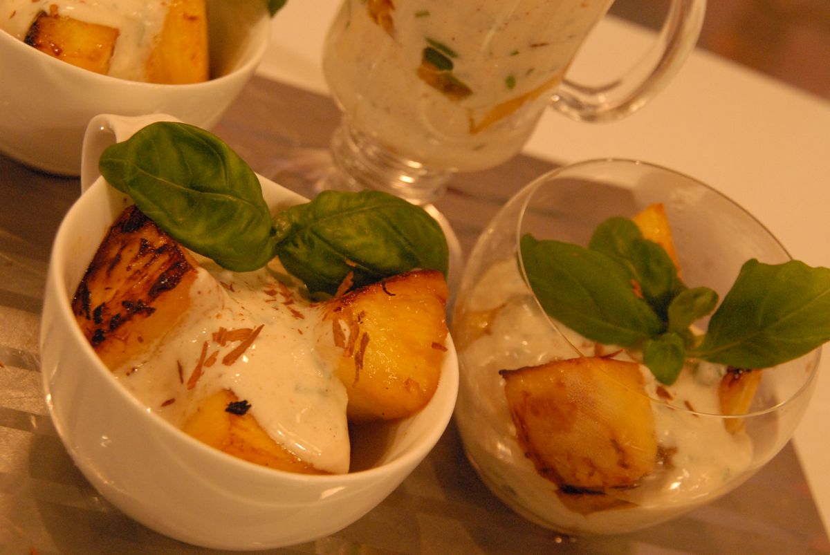 Ananasa obieramy i kroimy w grube kostki pamiętając o usunięciu biegnącego przez cały owoc „pnia zdrewniałego” elementu nie jadalnego. Na teflonowej lub ceramicznej patelni obsmażamy kawałki ananasa wraz z drobniutko pokrojonym imbirem. Po ok. 2 minutach smażenia dodajemy łyżkę konfitury lub 1/3 łyżki stołowej cukru. Obsmażamy do uzyskania złotego koloru przez kolejne ok 2 minuty – na koniec wciskamy sok z ½ cytryny. Ananas jest już gotowy do wyłożenia w naczynia. Mascarpone delikatnie ucieramy z cukrem oraz rozdrobnionym cynamonem i częścią bazylii. Gdy cukier jest już nie wyczuwalny kremem okładamy kawałki owoców. Dekorujemy listkami bazylii i podjemy w malutkich naczyniach, szklankach itp.