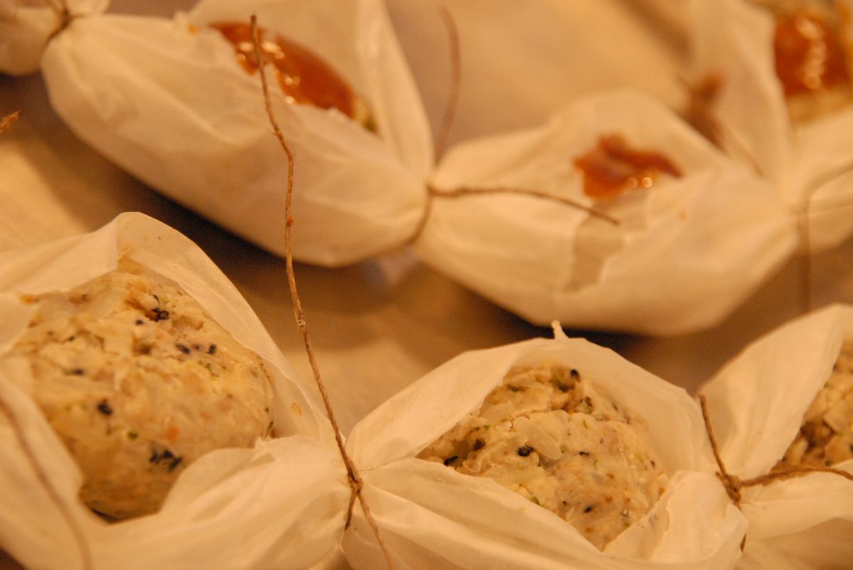 Mikserem lub maszynką do mięsa miksujemy mięso dorsza bez ości i skóry. Dodajemy pozostałe składniki , w tym gotowany biały ryż (lub jaśminowy)posiekane zioła, czosnek, i imbir opcjonalnie. Masa powinna być jednolita z zwarta. Pergamin rozwijamy z rolki tworząc dość długi ciąg ok 1 mb. Mięso formujemy w kulki ok. 4 cm średnicy i układamy w odstępach na papierze. Rolujemy papier i w odstępach przewiązujemy sznurkiem tworząc mini kiełbaski w papilocie. Tak przygotowane kiełbaski układamy zrolowane na blasze w piekarniku o temp. Ok 140’c i pieczemy 20 minut lub parzymy w bulionie bądź osolonej wodzie ok 15 minut.