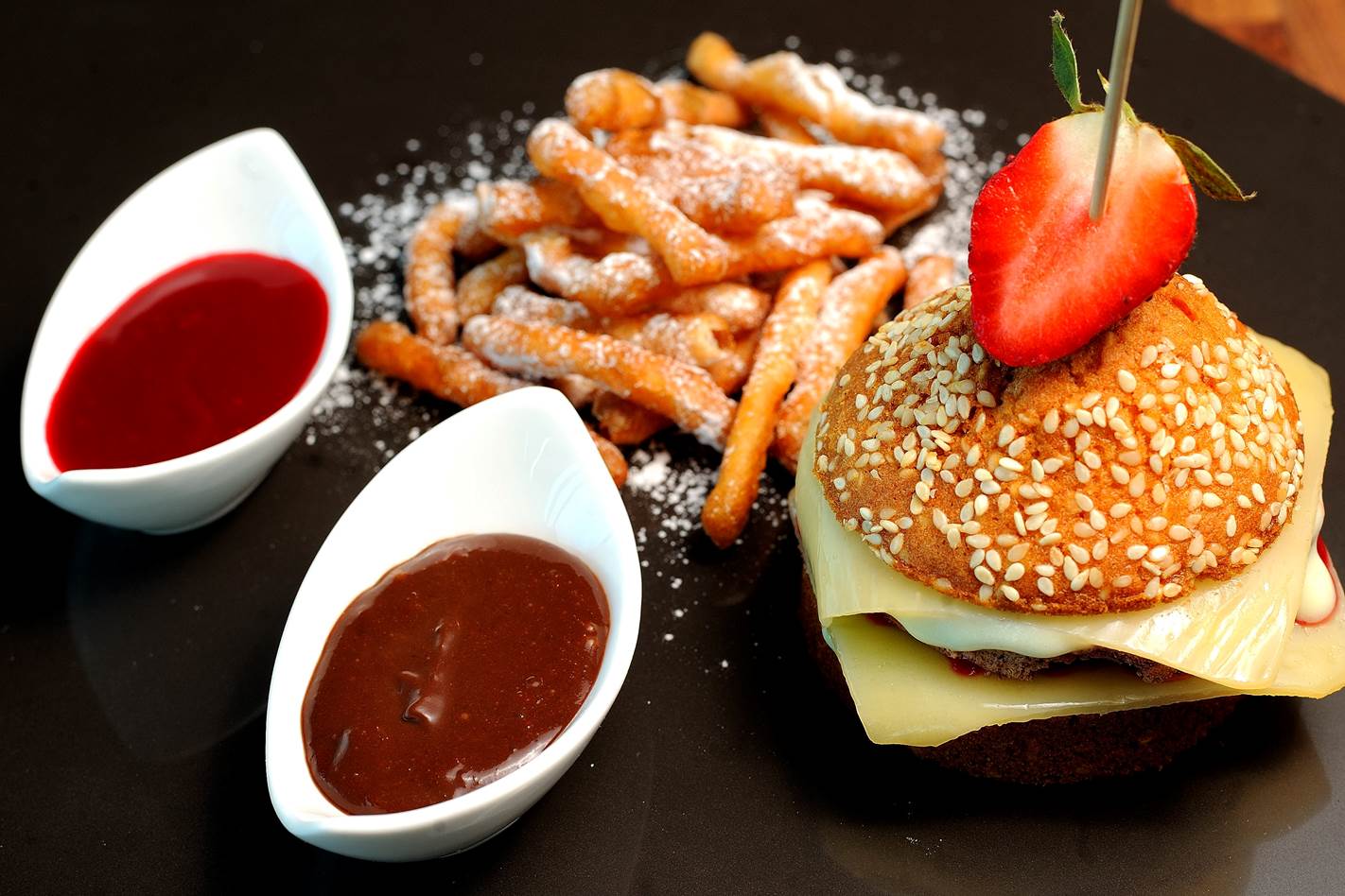 - Słodko?? Słodko być musi więc hambuger, ale inny bo słodki właśnie. Dla leniuszków - gotowa mufinka, rozcięta. Następnie krem śmietankowy, plasterki kiwi i może mango, ser czyli galaretka cytrynow lekko przed wylaniem na blaszkę zaciągnięta śmietanką - otrzymamy barwę zbliżoną do sera. Następnie ketchup, czyli sos z malin lub truskawek. No i najważniejszy składnik - hamburger - sugeruję tzw genache z czekolady czyli niemal zagotowana śmietanka, a nią zalana czekolada po lekkim mieszaniu i niemal podbiciu stanie się jedwabista i lśniąca - wtedy formujmy hamburger i wkładamy do lodówki. Gdy zastygnie otrzymamy słodki hamburger. I znów sos śmietankowy lub waniliowy, niby ser, niby ketchup i wierzch bułki czyli mufinka. Frytki to np. ciasto jak na racuchy lane na głęboki tłuszcz a następnie obsuszone bibułką - wynik jeśli pobawimy się ładnie formą rozśmieszy Was na nowy rok.