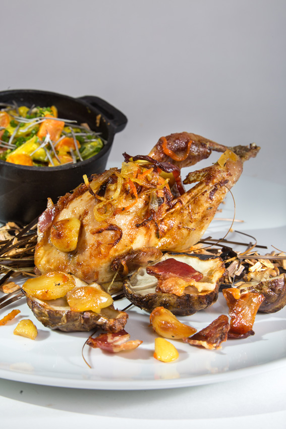 Przepiórkę oczyszczoną nacieramy solą i pieprzem a następnie masłem. Układamy w naczyniu żaroodpornym z pokrywą, na przepiórkę kładziemy plasterek boczku i nakrywamy pokrywą pieczemy w temperaturze ok 180’c przez 35 – 40 minut.