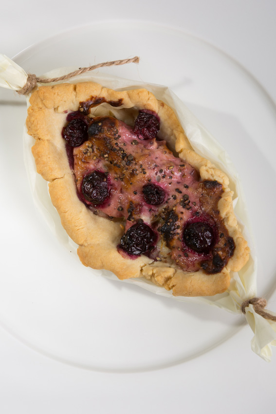 Na wierzchu układamy kilka wiśni z konfitury i wkładamy do piekarnika. Pieczemy w tempertaturze 170’c do zapieczenia całej masy – wiśnia lekko karmelizuje się a ser zapiecze. Najlepiej smakuje podawana na ciepło z bukietem sałat.